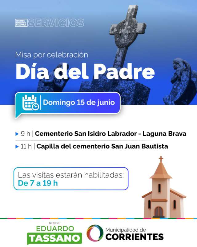 La Municipalidad de Corrientes informó sobre el funcionamiento de los cementerios San Juan Bautista, del barrio Virgen de los Dolores, y San Isidro Labrador de Laguna Brava, por conmemorarse el domingo el Día del Padre. El horario de visitas durante el sábado y domingo será de 7 a 19.