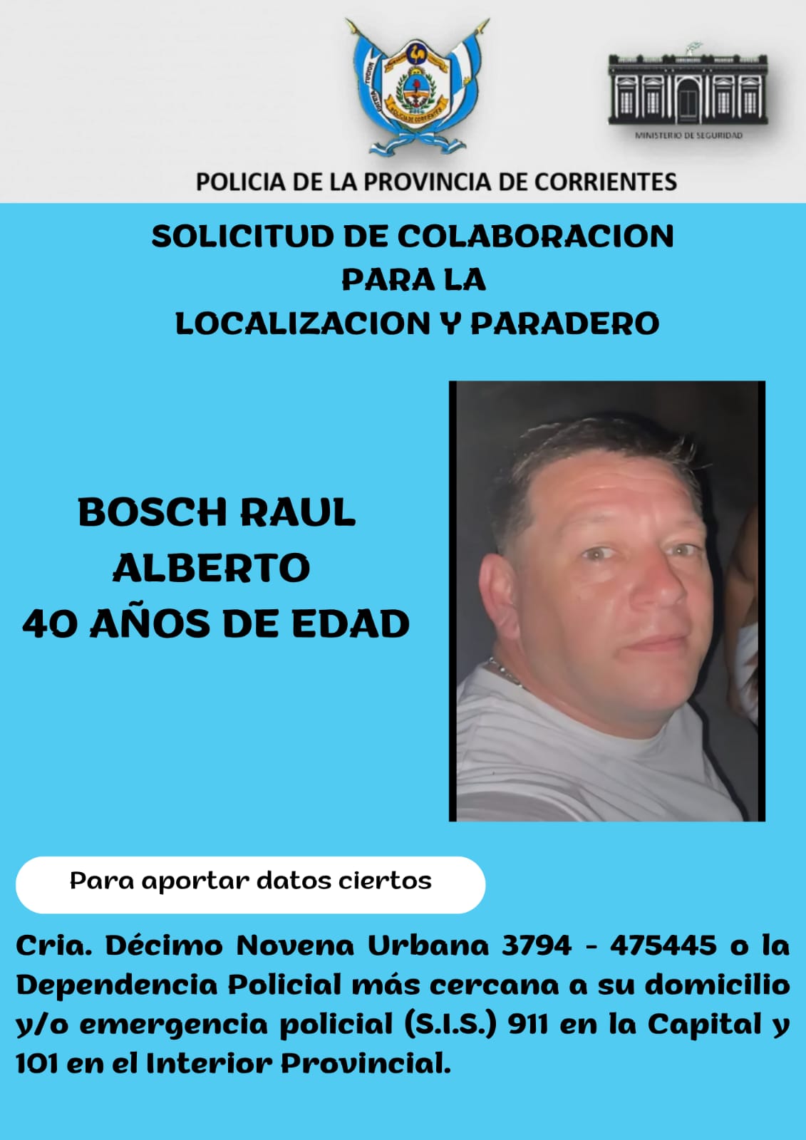 La Policía de Corrientes emitió un pedido de colaboración para encontrar a Raúl Alberto Bosch, de 40 años, quien se encuentra desaparecido desde el pasado 25 de septiembre. La denuncia fue realizada por una persona de apellido Romero y tomó intervención la Fiscalía de Investigación en turno.