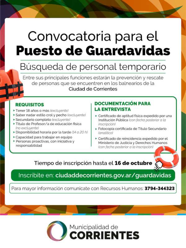 La convocatoria iniciada por la Municipalidad de Corrientes está dirigida a mayores de edad que sepan nadar, posean título secundario y tengan disponibilidad horaria por la tarde. Se valorará tener el título de profesor de educación física. Las inscripciones se reciben hasta el 16 de octubre. Se busca reforzar el actual plantel fijo de 25 guardavidas para la temporada de afluencia masiva.