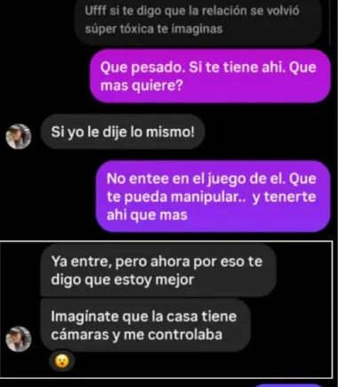 Esa convivencia terminó mucho antes de lo previsto. Según sus propias palabras, el hombre la controlaba mediante cámaras en la casa y revisaba todo lo que hacía: “Uff, si te digo… la relación se volvió súper tóxica en todos los sentidos. Imaginate que la casa estaba llena de cámaras y me controlaba”.