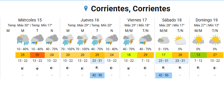 El Servicio Meteorológico Nacional (SMN) emitió una alerta amarilla por fuertes tormentas en toda la provincia de Corrientes. El organismo anticipó que las lluvias continuarán hasta el viernes, mientras que el fin de semana se presentará más estable y sin lluvias, con un domingo ideal para celebrar el Día de la Madre.
