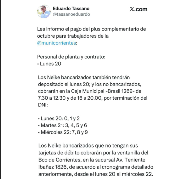 El cronograma se extenderá hasta el miércoles 22 de octubre, según lo anunció el intendente Eduardo Tassano a través de sus redes sociales.