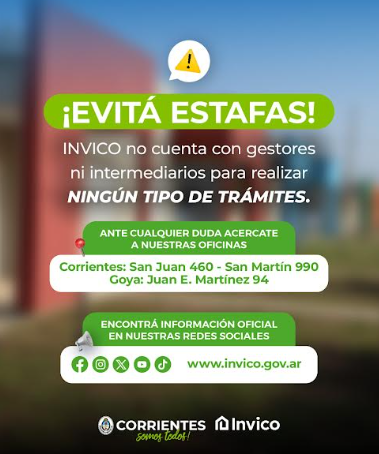 El Instituto de Vivienda de Corrientes (INVICO) emitió un comunicado oficial en el que advirtió a la ciudadanía que no cuenta con gestores ni intermediarios para realizar ningún tipo de trámite, inscripción o consulta vinculada a sus programas habitacionales.