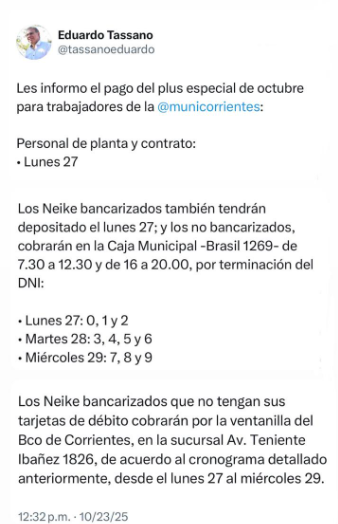 El cronograma de este adicional de octubre se extenderá hasta el miércoles 29, según anunció el intendente Eduardo Tassano a través de sus redes.