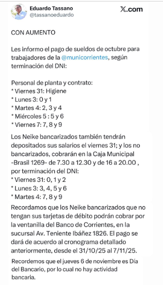 El cronograma salarial se extenderá hasta el 7 de noviembre -hay feriado bancario en medio-, según lo anunció el intendente Eduardo Tassano a través de sus redes sociales. Los haberes tendrán un incremento acordado en mesa paritaria de septiembre.