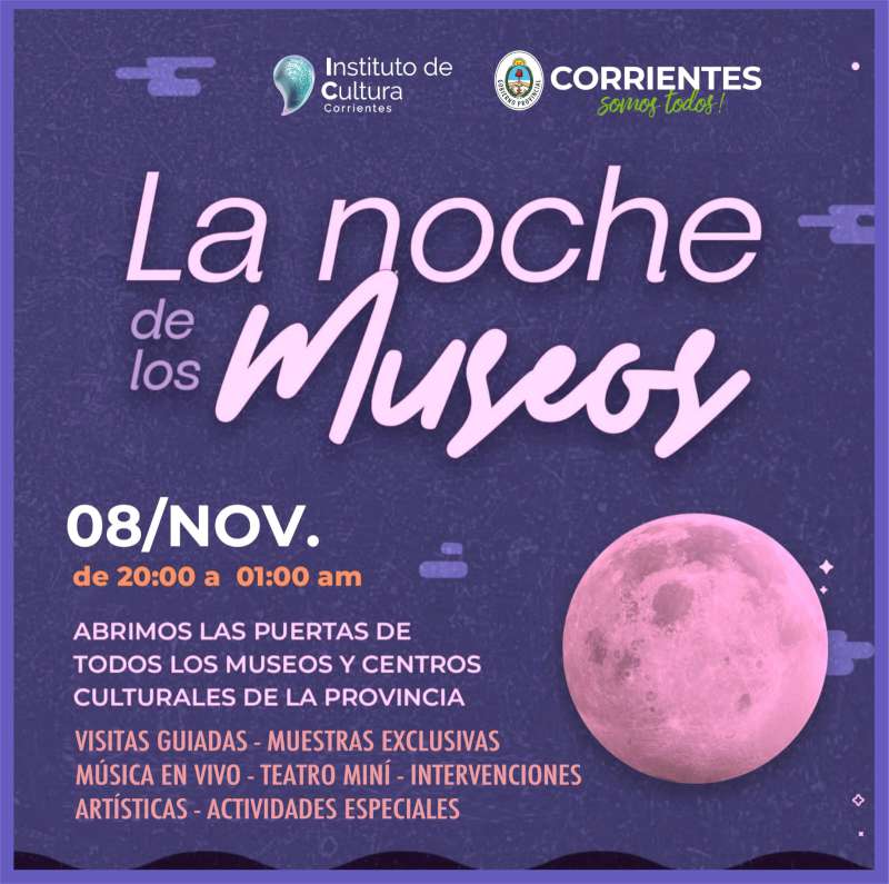 El Instituto de Cultura de Corrientes realizará este miércoles a las 11 horas, la presentación oficial de La Noche de los Museos 2025, que se desarrollará en museos y espacios culturales de toda la Provincia. El evento donde tendrá lugar el lanzamiento de la propuesta, será en el Patio de la Cultura “Marité Salas” de dicho organismo público, ubicado en San Juan 546 de esta Capital.