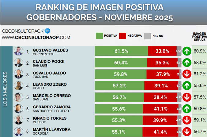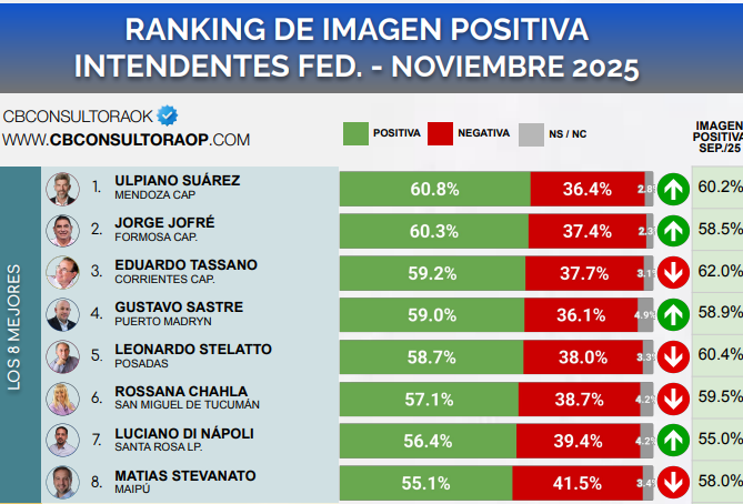 Aquí la encuesta completa de CB Consultora Opinión Pública correspondiente a noviembre de 2025, con el ranking de gobernadores e intendentes: