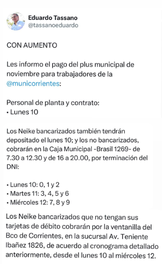 Desde este mes se aplica un nuevo aumento en estos conceptos, acordados en su momento en paritarias. El cronograma de este primer adicional de noviembre se extenderá hasta el miércoles 12, según anunció el intendente Eduardo Tassano a través de sus redes.