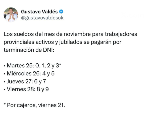 El gobernador de Corrientes, Gustavo Valdés dio a conocer el cronograma de liquidación de los haberes que comienza el martes 25 y se extiende hasta el viernes 28. Alcanza a los agentes de la administración pública provincial, activos, jubilados y pensionados.