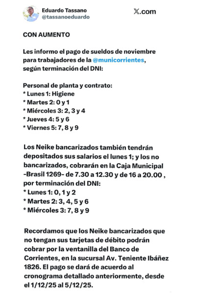 En tanto que los Neike bancarizados, pero que aún no tengan tarjetas de débito, podrán cobrar en la sucursal del Banco de Corrientes de av. Teniente Ibáñez 1826. Este segmento de trabajadores deberá regirse por el cronograma con terminación de DNI detallado anteriormente y que va del lunes 1° de diciembre al viernes 5 de diciembre.