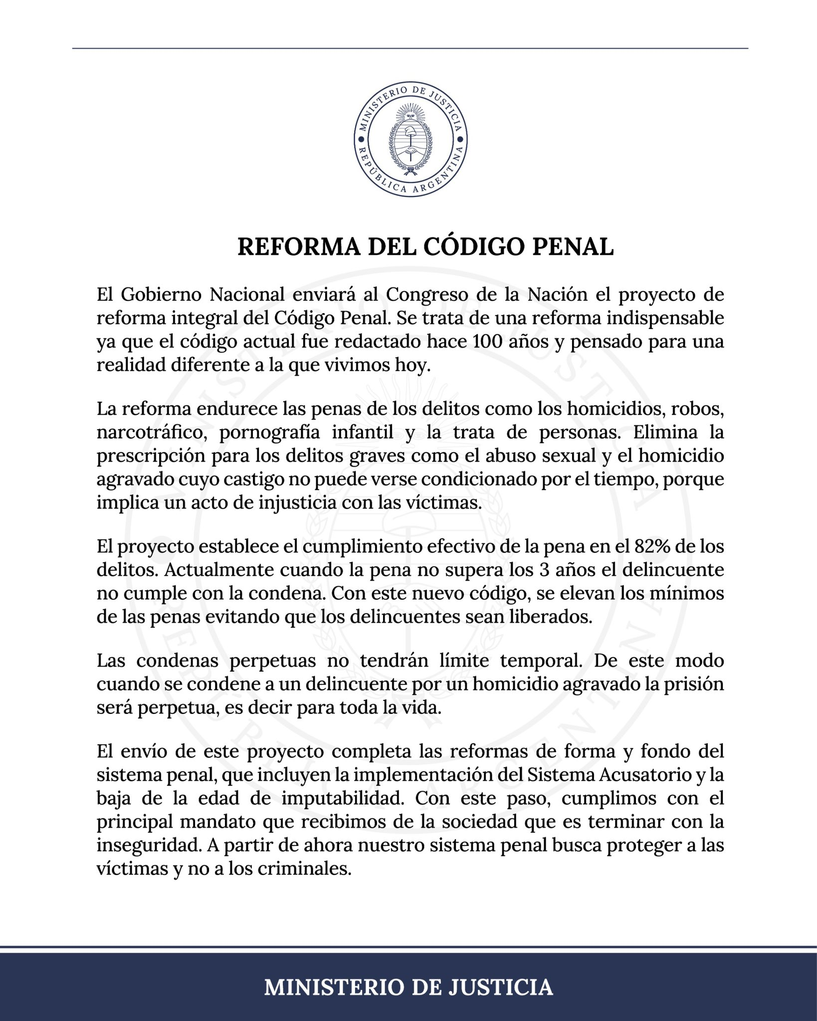 El Gobierno nacional anunció que enviará al Congreso un proyecto de reforma integral del Código Penal, con modificaciones profundas en materia de penas, nuevas figuras delictivas y criterios de imputabilidad. Se trata del cambio más ambicioso desde 1921 y apunta a endurecer el castigo frente a delitos violentos, corrupción, crimen organizado, narcotráfico y abusos contra menores.