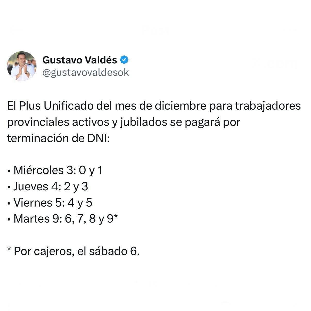 A través de sus redes sociales, el primer mandatario correntino Gustavo Valdés dio a conocer el comienzo desde este miércoles 3, del cronograma de pago del Adicional Remunerativo Mensual (Plus Unificado) correspondiente a diciembre, de $110 mil, que alcanza a los agentes activos, jubilados y pensionados de la administración pública provincial.