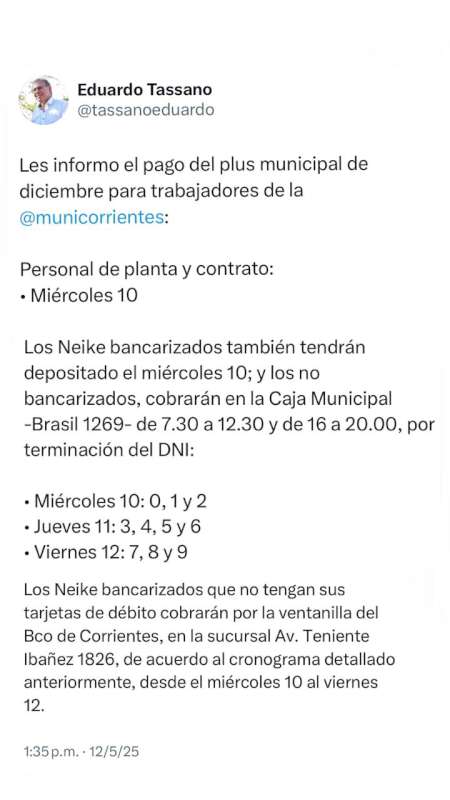 El cronograma de este primer adicional de diciembre se extenderá hasta el viernes 12, según anunció el intendente Eduardo Tassano a través de sus redes.