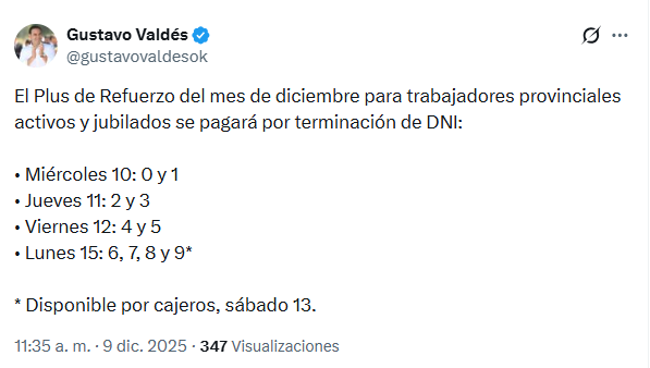 A través de sus redes sociales, el primer mandatario correntino Gustavo Valdés, dio a conocer el comienzo desde este miércoles 10, del cronograma de pago del Plus de Refuerzo correspondiente a diciembre, de $100 mil, que alcanza a los agentes activos, jubilados y pensionados de la administración pública provincial.