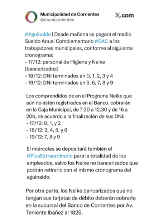 En tanto, los Neike bancarizados, pero que no poseen tarjeta de débito, deberán cobrar por ventanilla del Banco de Corrientes (sucursal Av. Teniente Ibáñez 1826) de acuerdo al cronograma detallado anteriormente, que va del miércoles 17 al viernes 19 de diciembre.