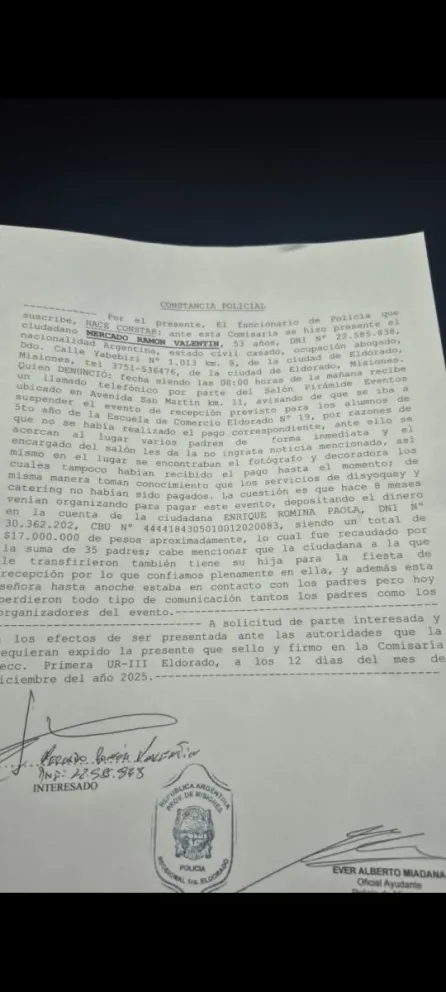A pocas horas del inicio del evento, los estudiantes supieron que no había catering, DJ ni fotógrafo contratados, ya que ninguno de los servicios había sido abonado. Ramón Mercado, padre de uno de los egresados, calificó el hecho como “una de las estafas más grandes conocidas en Eldorado”.