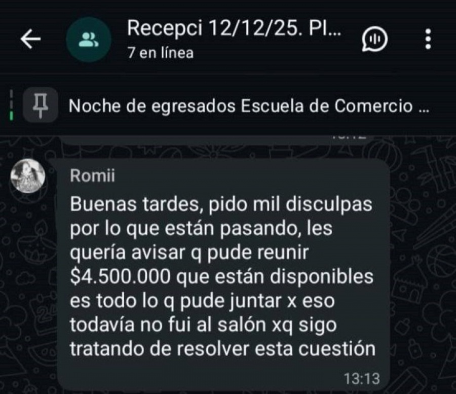 La responsable de administrar los fondos era Romina Enríquez, de 42 años, quien había recibido aportes mensuales de aproximadamente 60.000 pesos por familia. El viernes al mediodía, mientras los padres ultimaban detalles para la recepción, los dueños del salón se comunicaron para advertir que el evento sería cancelado si no se abonaba la totalidad de lo pactado.