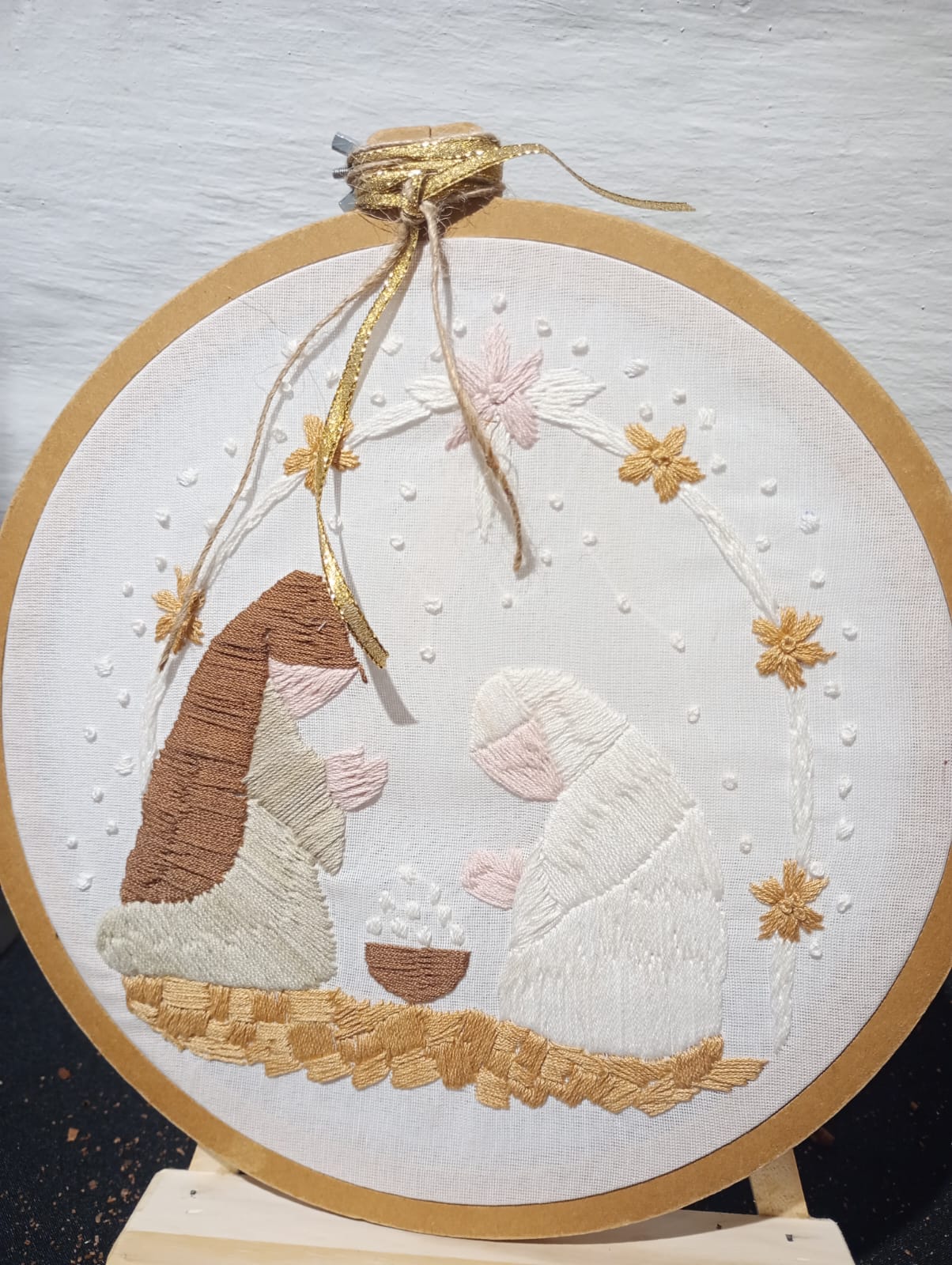 A través de la puntada plana, las figuras centrales adquieren un acabado liso y sereno, contrastando con las puntadas entrelazadas que dan relieve a las vestiduras. Además, la puntada de Margarita hace florecer detalles dorados y una estrella central llena de volumen. Aquí, la textura es la que habla, prescindiendo de adornos innecesarios para dejar que el arte hable por sí solo.