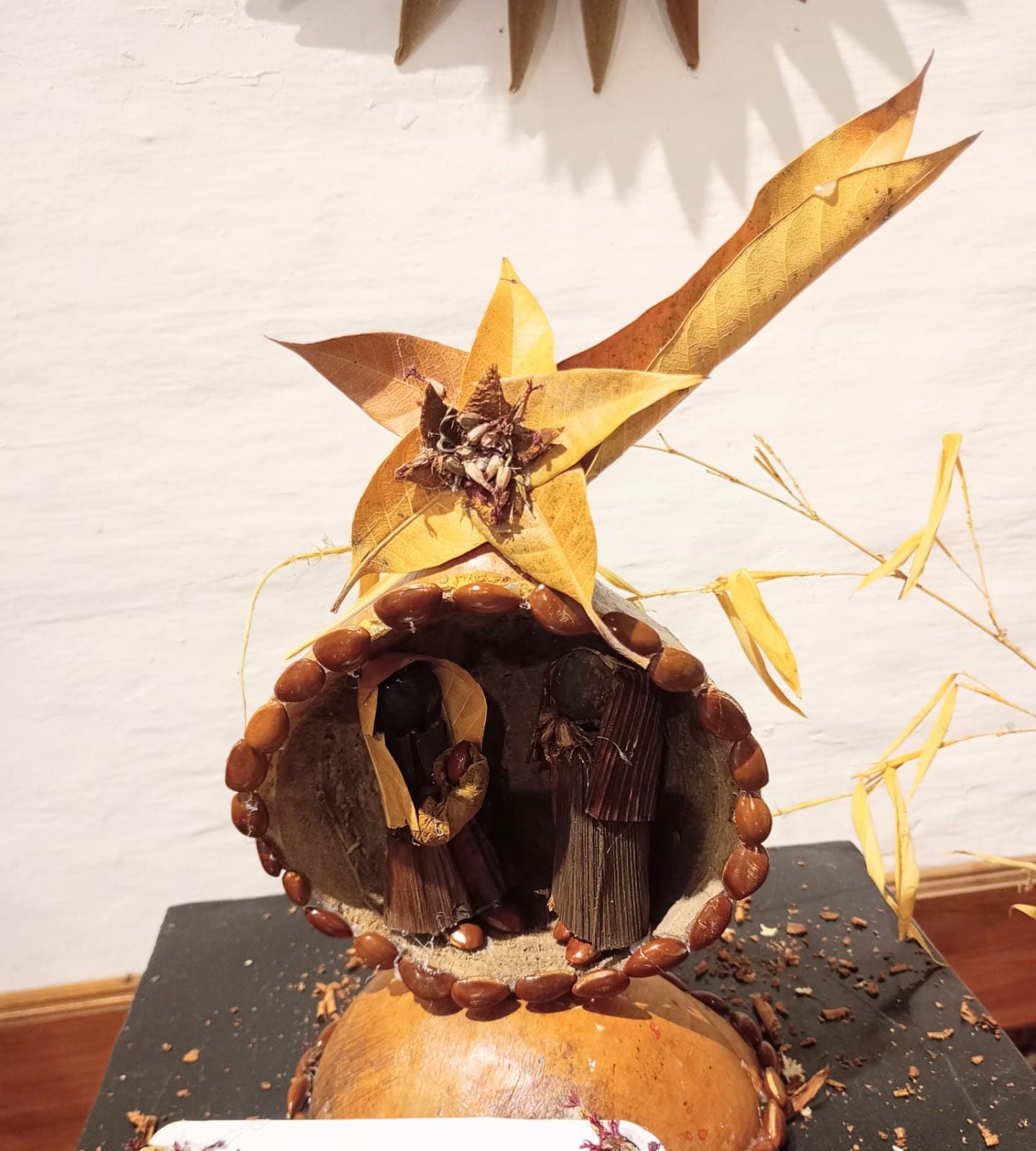 La escena se desarrolla dentro de un porongo (calabaza) ahuecado, transformándolo en una gruta natural de singular belleza. Semillas secas ornamentan los bordes de la abertura, mientras que fibras de hojas naturales dan forma a la Estrella de Belén.