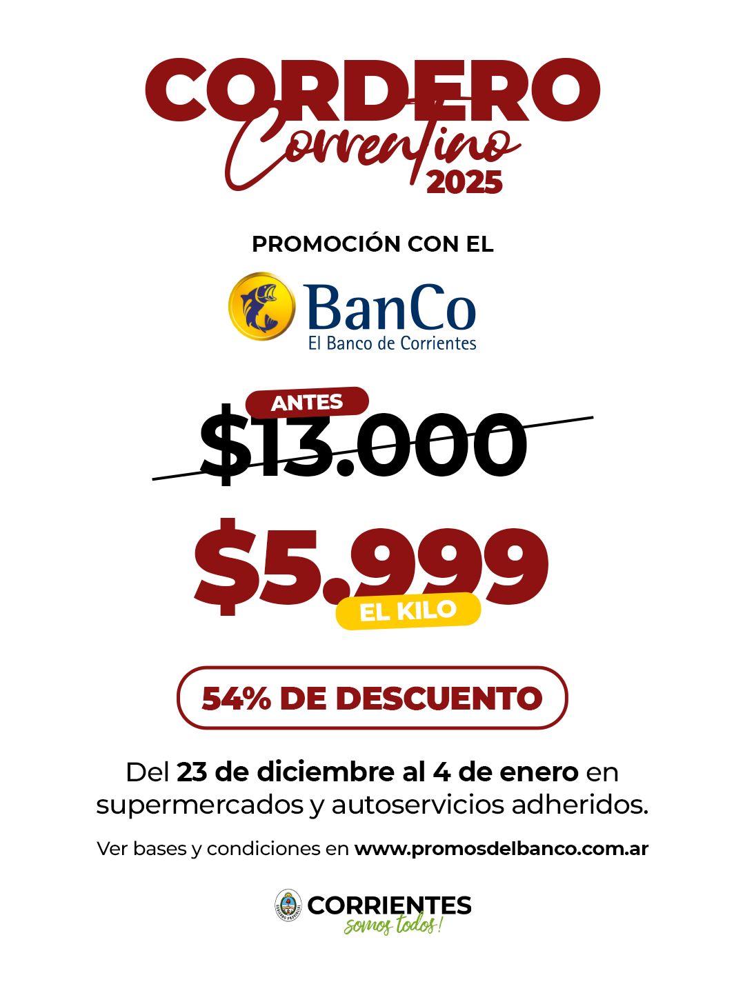 El Cordero Correntino 2025 está vigente desde el 22 de diciembre de 2025 hasta el 4 de enero de 2026, inclusive. La oferta es resultado de un acuerdo entre el Gobierno provincial, el Banco de Corrientes, la Cámara Correntina de Supermercados y Autoservicios y frigoríficos locales.