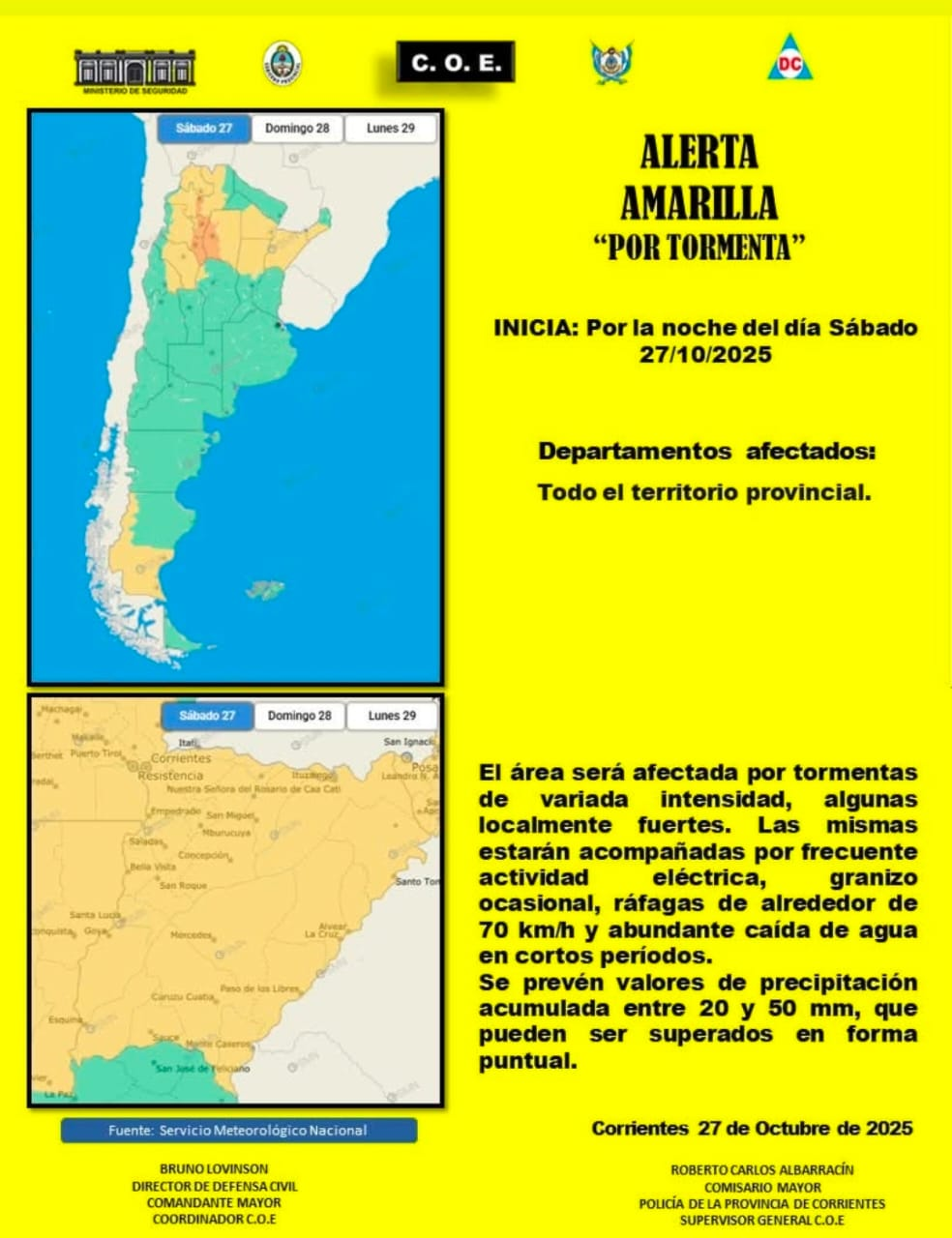 El Comando Operativo de Emergencias informó que rige una alerta amarilla por tormentas para todo el territorio de la Provincia de Corrientes, con vigencia desde la noche de este sábado. La advertencia alcanza a todas las localidades y zonas rurales de la provincia.
