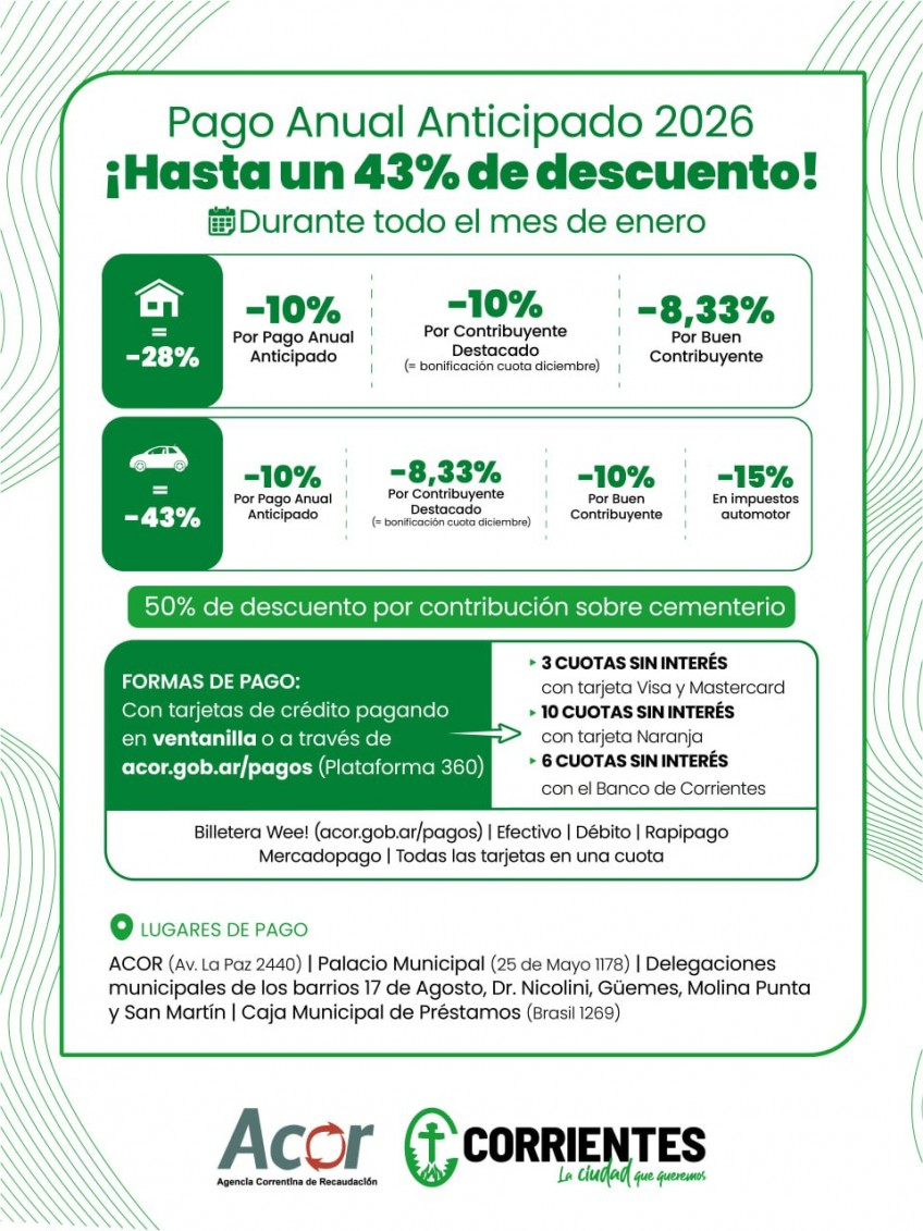 Según detallaron desde la Agencia Correntina de Recaudación (ACOR), los beneficios surgen de la acumulación de distintos incentivos: un 10% por “buen contribuyente”, otro 10% por “pago anual”, un 15% por “pago en término” y un 8,3% adicional por “contribuyente destacado”, que equivale a la asignación de la última cuota del año.