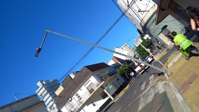 Según las primeras informaciones, el transporte circulaba por San Martín cuando enganchó el cableado aéreo, arrancando parte de la instalación y dejando un poste de alumbrado público prácticamente inclinado sobre la vereda.