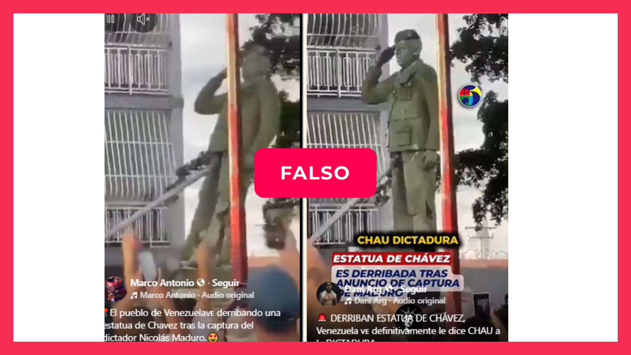 Luego de la captura del dirigente venezolano Nicolás Maduro por fuerzas estadounidenses, comenzó a circular en Facebook, X y TikTok un video en el que un grupo de personas derriba una estatua del fallecido expresidente Hugo Chávez.