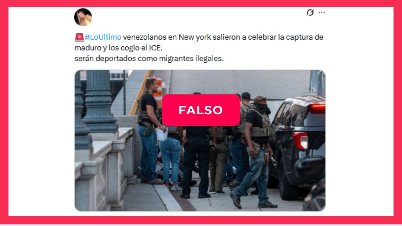 En redes sociales (X y Facebook) circula una imagen de un supuesto operativo del ICE (Servicio de Control de Inmigración y Aduanas de Estados Unidos) contra venezolanos que salieron a celebrar en Nueva York la detención de Nicolás Maduro.