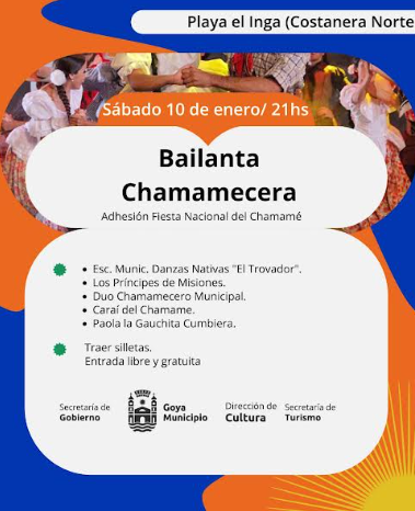 La ciudad de Goya volverá a latir al ritmo del chamamé con una gran bailanta chamamecera que se realizará el sábado 10, desde las 21 horas, en el paseo costero Costanera Norte, específicamente en playa El Inga, con entrada libre y gratuita. La propuesta invita a llevar silleta, calzado cómodo y muchas ganas de bailar.