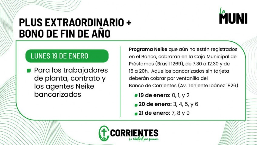 El Municipio de Corrientes inicia este lunes 19 de enero el pago de la primera cuota del bono de fin de año junto con el plus complementario para los trabajadores municipales capitalinos. El cronograma se extenderá hasta el miércoles 21, según confirmó el Ejecutivo local.