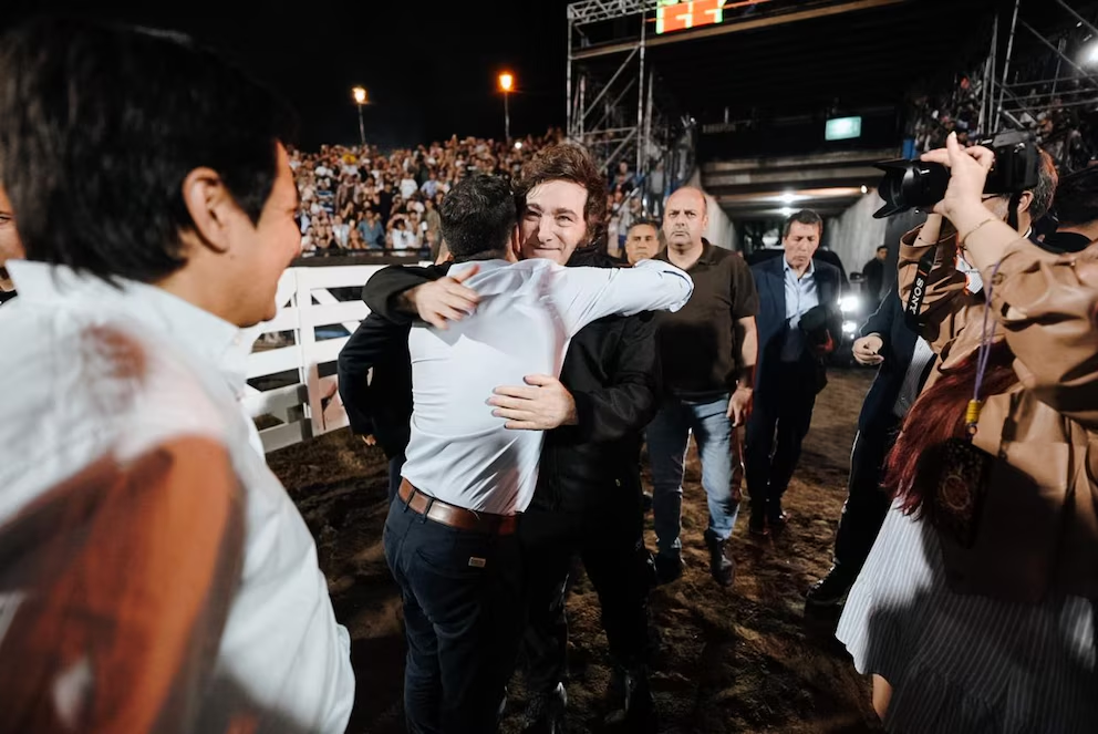 Milei dudó al principio, se definió como “amateur” y le cedió el lugar al cantor. Pero el Chaqueño insistió: “Venga, venga. Vamos a poner la letra ahí. Canta rock, canta las de Favio, ¿cómo no va a cantar con el Chaqueño?”. Hubo abrazo y escenario compartido.