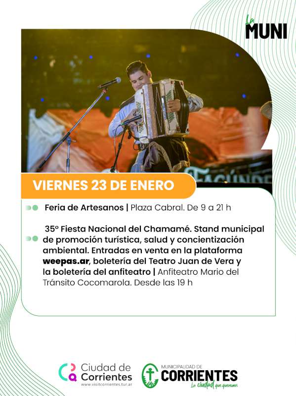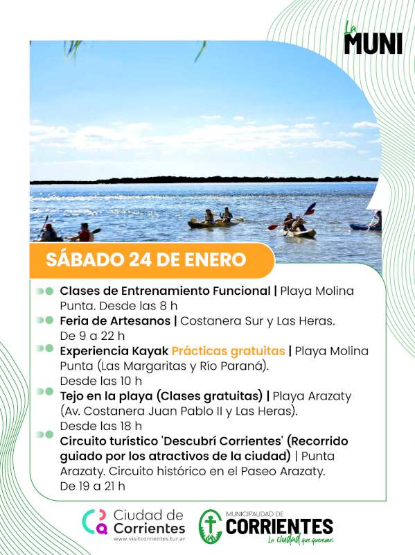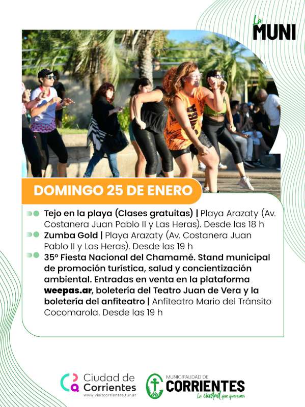 La Municipalidad de Corrientes propone para este fin de semana una amplia agenda de actividades gratuitas y abiertas a todo público, pensadas tanto para vecinos como para turistas. Del viernes 23 al domingo 25 de enero habrá ferias, circuitos turísticos, actividades deportivas en la playa y la continuidad de la 35° Fiesta Nacional del Chamamé, con presencia del stand municipal de promoción turística, salud y concientización ambiental.
