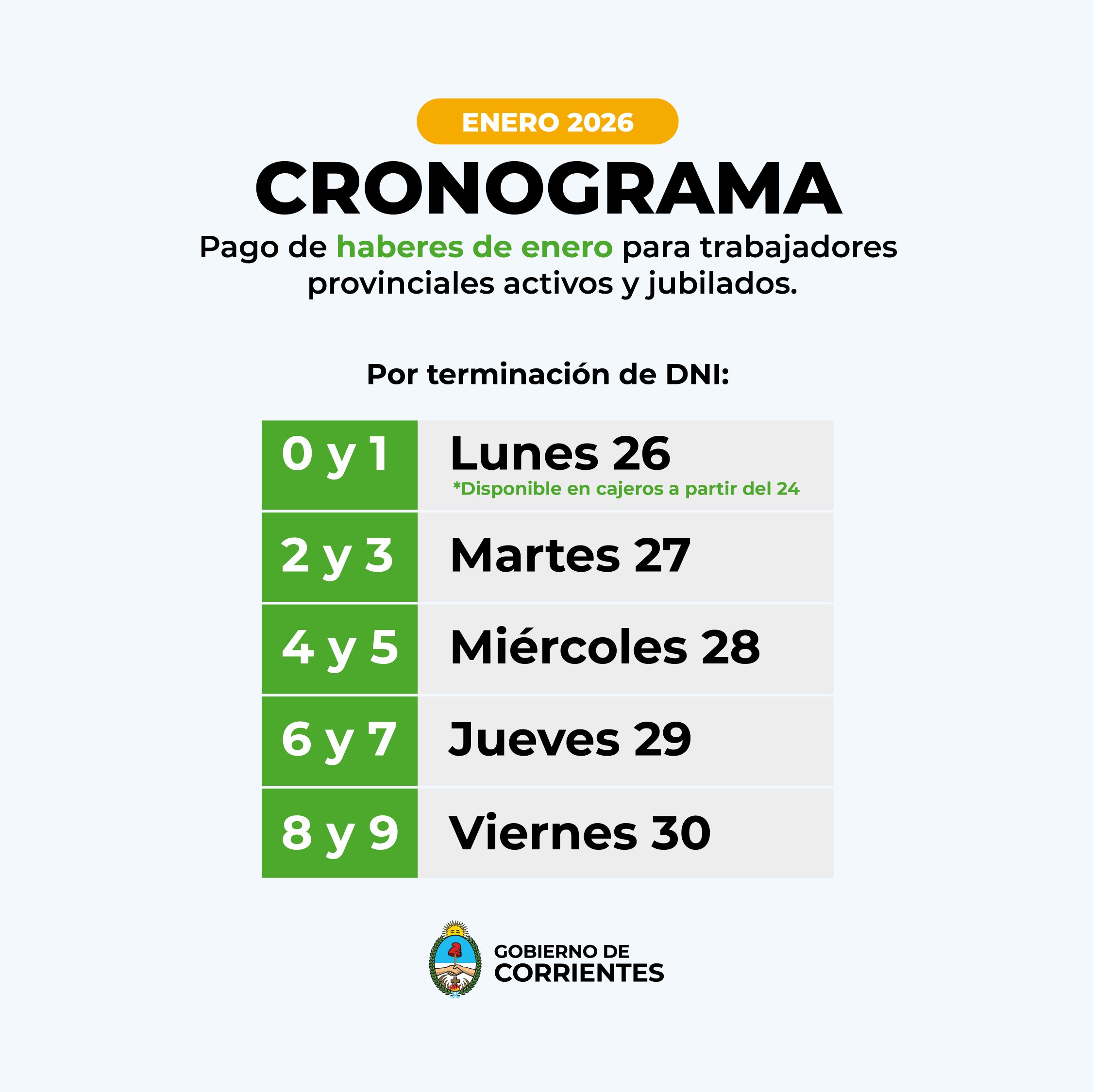 El cronograma de pago de sueldos comienza este lunes 26, jornada que percibirán los agentes con números de Documento Nacional de Identidad terminados en 0 y 1; este tramo estará disponible desde el sábado 24, a través del hombaking de la caja sueldo de cada agente y, también, de los cajeros automáticos habilitados por el Banco de Corrientes SA.