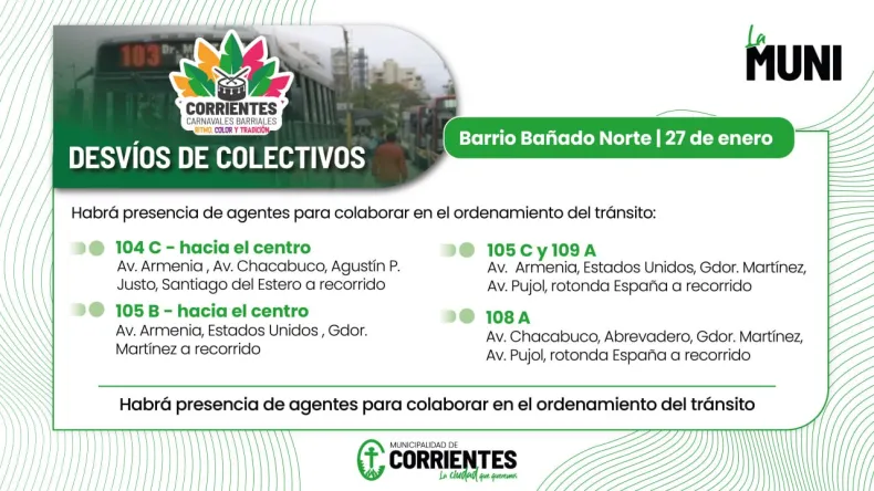En ese marco, la Municipalidad de Corrientes informó que las 18 de este martes, se implementan cambios temporales en la circulación y en los recorridos de cinco líneas del transporte urbano en el barrio Bañado Norte, debido a los cortes y desvíos establecidos en la zona del corsódromo barrial.