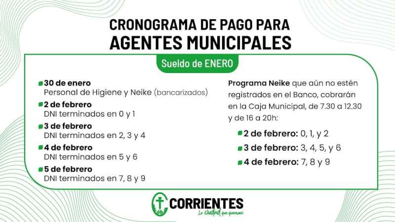 En tanto que los Neike bancarizados, pero que aún no tengan tarjetas de débito, podrán cobrar en la sucursal del Banco de Corrientes de av. Teniente Ibáñez 1826. Este segmento de trabajadores deberá regirse por el cronograma con terminación de DNI detallado anteriormente y que va del viernes 30 de enero al jueves 5 de febrero.