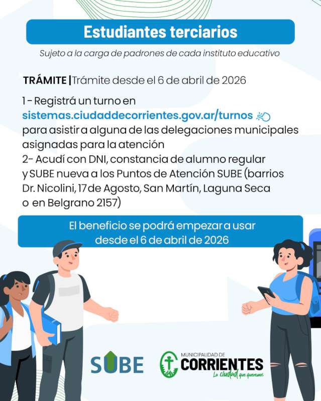 La Municipalidad de Corrientes habilita la reactivación de la SUBE estudiantil desde febrero para estudiantes primarios, secundarios y universitarios. Será con un mecanismo de reactivación automática para quienes ya gozaban del beneficio en el 2025, mientras los que realizan el trámite por primera vez, deberán acercarse a los puestos de atención, con turno previo solicitado en: