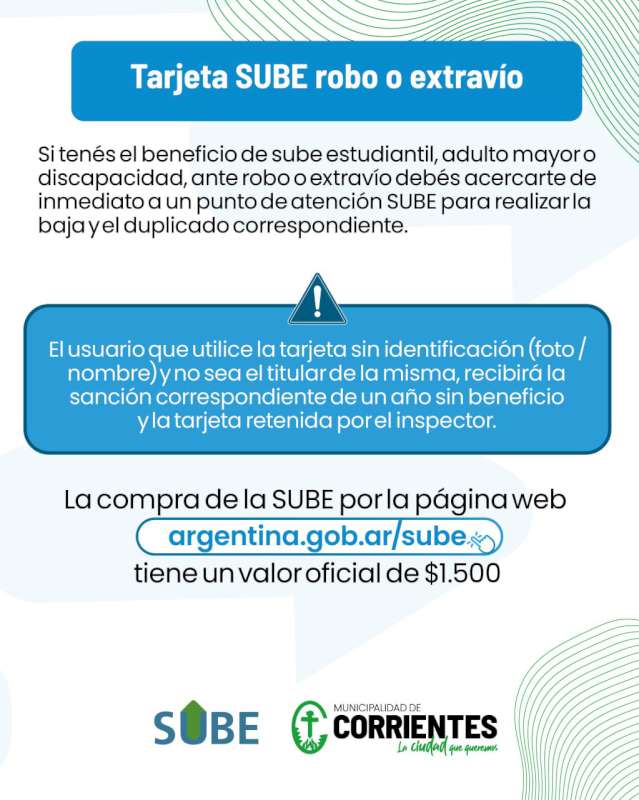 En caso de solicitar la SUBE estudiantil por primera vez, deberán sacar un turno en sistemas.ciudaddecorrientes.gov.ar/turnos desde el 9 de febrero. Posteriormente deberán acudir al turno con DNI, plástico y constancia de alumno regular (digital o impreso) y una tarjeta nueva.