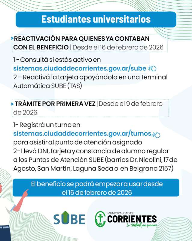 Los universitarios podrán activar el beneficio desde el 16 de febrero y tendrán la posibilidad de comenzar a usarlo desde esa misma fecha. Podrán consultar si están activos en www.sistemas.ciudaddecorrientes.gov.ar/sube