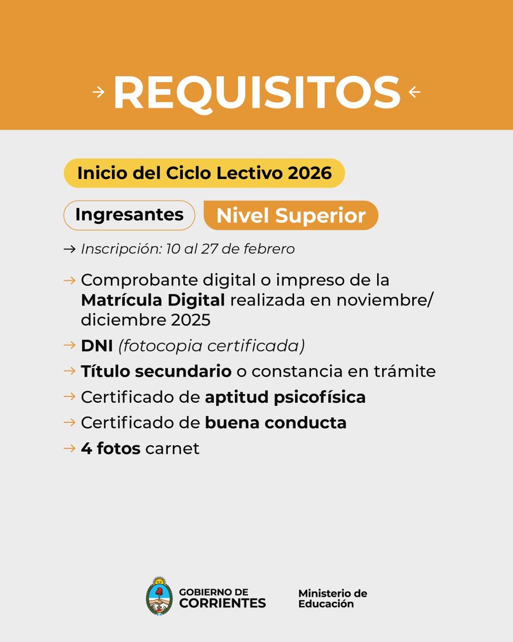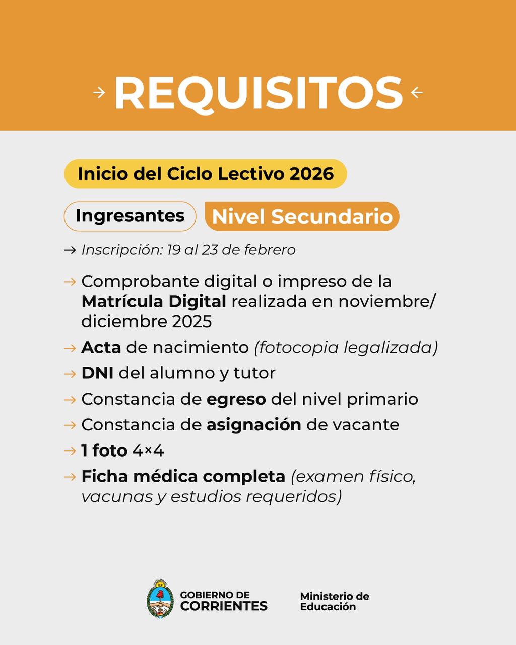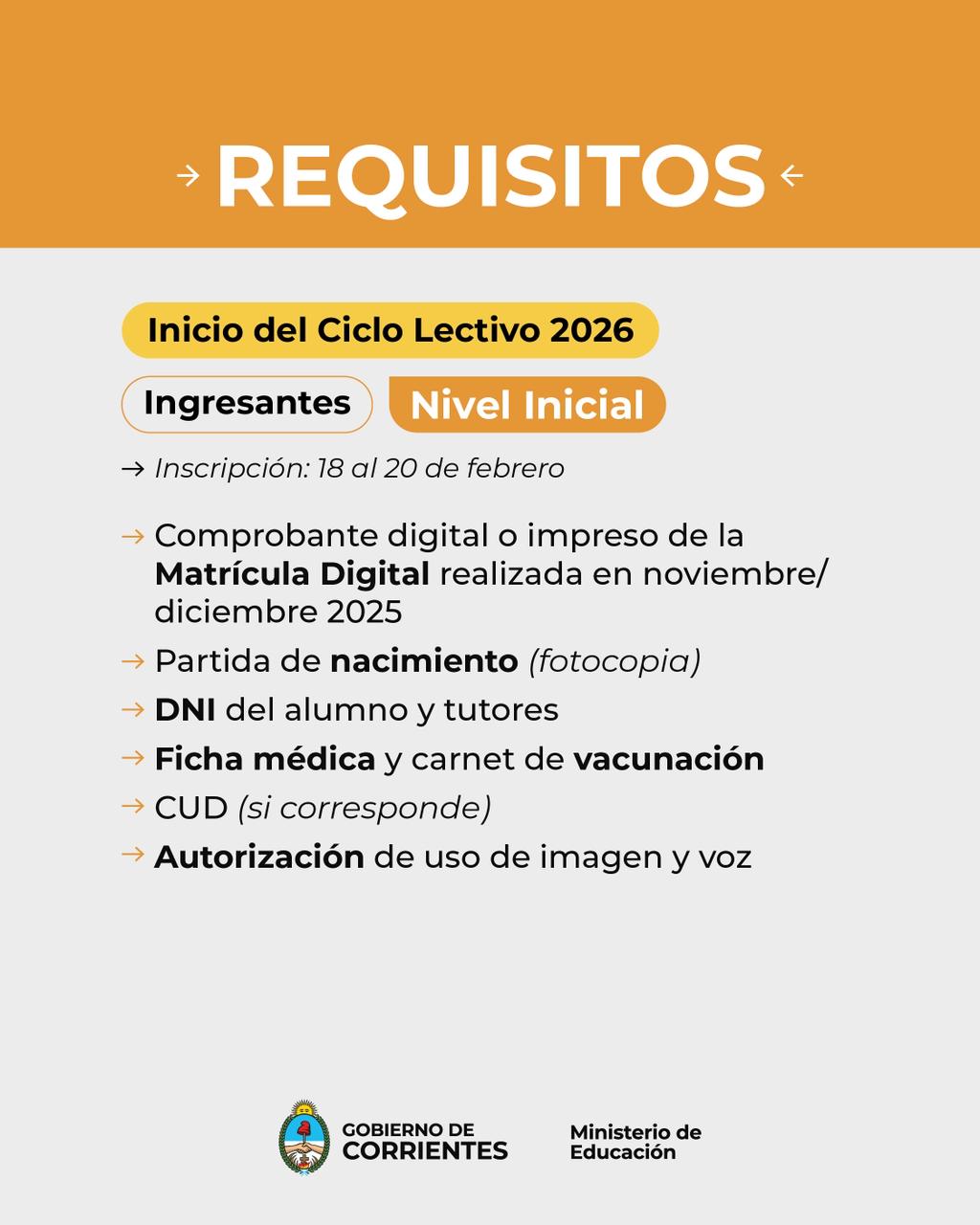 El Gobierno de Corrientes, a través del Ministerio de Educación, informó que los alumnos de todos los niveles deberán presentarse en las instituciones a las que fueron asignados, para completar allí el proceso de inscripción. En los niveles inicial y primario este trámite deberá realizarse del 18 al 20 de febrero. Para el secundario la fecha asignada es del 19 al 23 de febrero, y para el nivel superior la fecha es del 10 al 27 de febrero.