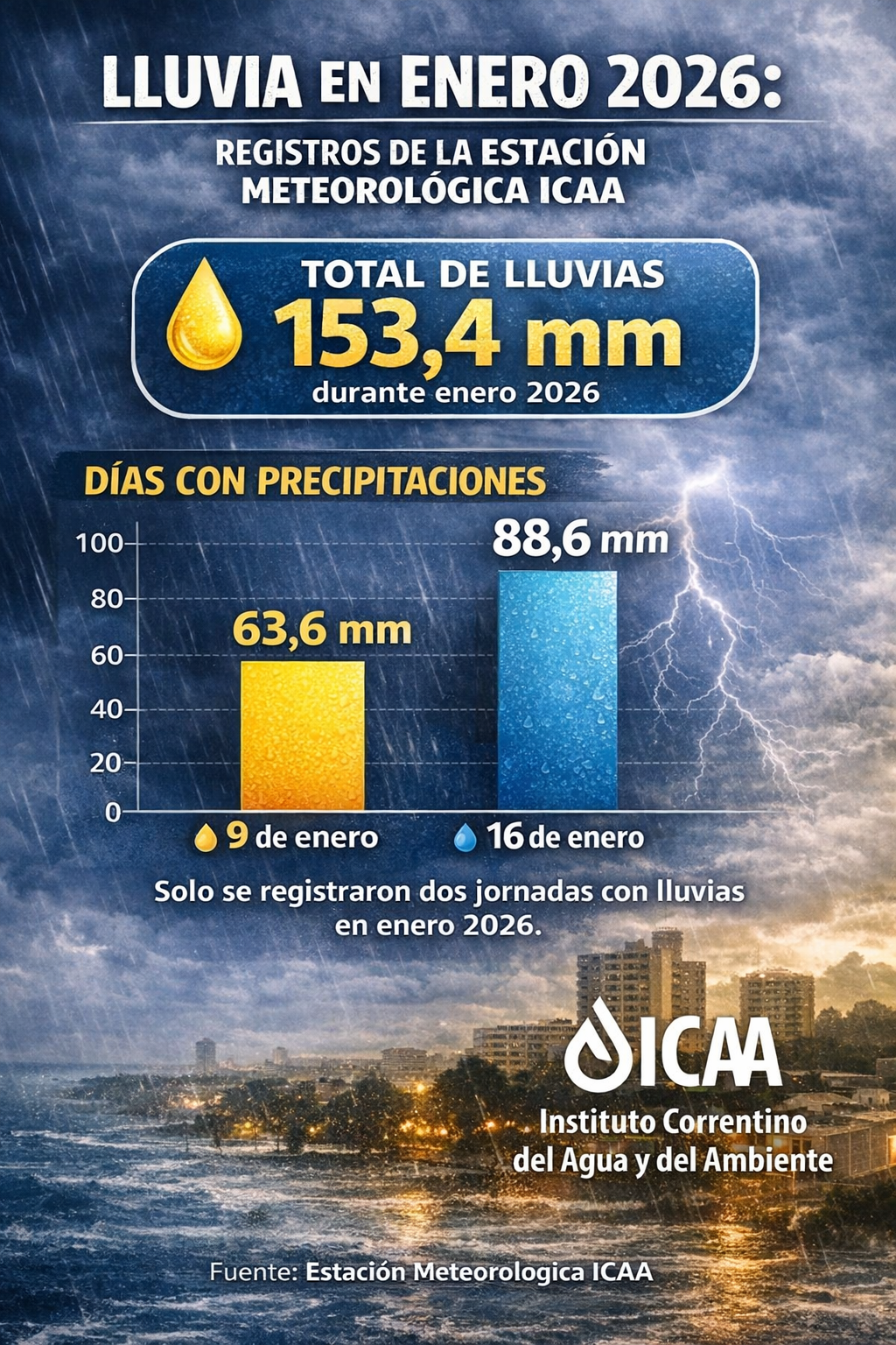 De acuerdo a los datos de la Estación Meteorológica ICAA, durante el mes de enero 2026 las lluvias alcanzaron en Corrientes capital un total de 153,4 milímetros. Mientras que la temperatura máxima registrada fue de 41,5ºC el día 27 a las 12:00 horas, y la temperatura mínima mensual fue de 17,1ºC el día 04 a las 06:00 horas.