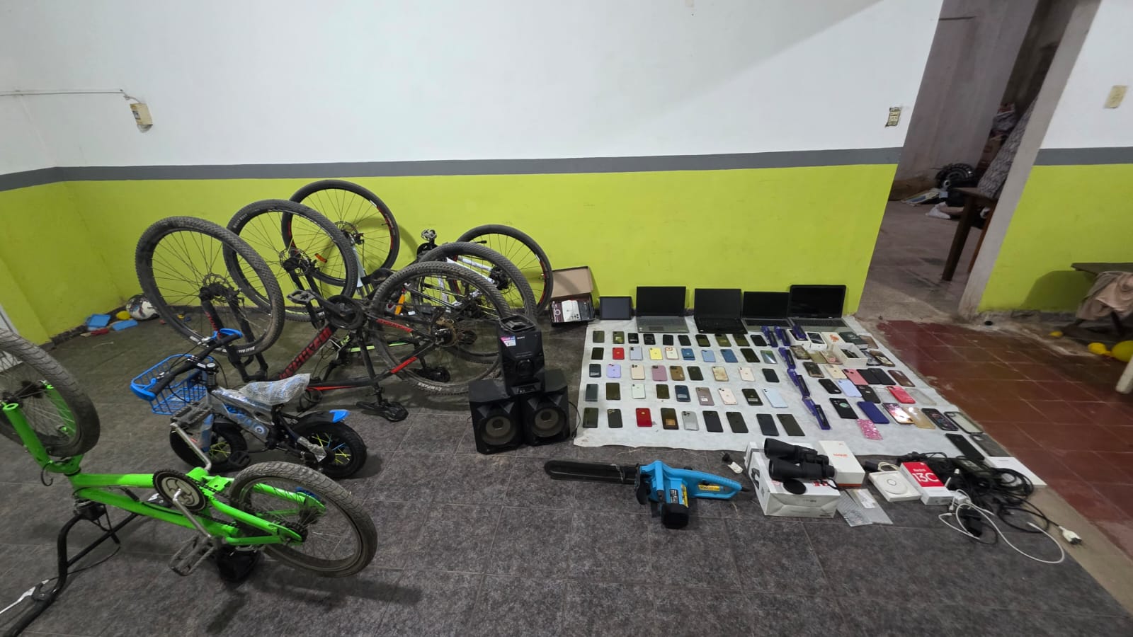Entre los objetos incautados se contabilizaron 47 teléfonos celulares (27 de ellos iPhone de alta gama), cuatro notebooks, una tablet, un binocular profesional, una motosierra, cinco bicicletas de distintos rodados, un aire acondicionado y un ventilador, entre otros elementos. Todos presentaban características compatibles con una posible procedencia ilícita, por lo que fueron secuestrados preventivamente.