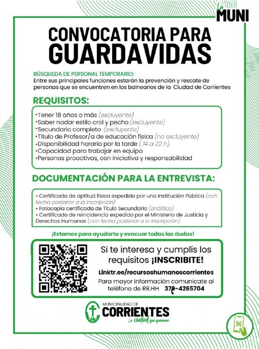 La Municipalidad de Corrientes informó que busca personal temporario para cubrir puestos de guardavidas, dirigido a mayores de edad que sepan nadar, posean título secundario y tengan disponibilidad horaria por la tarde. Se valorará tener el título de profesor de educación física.