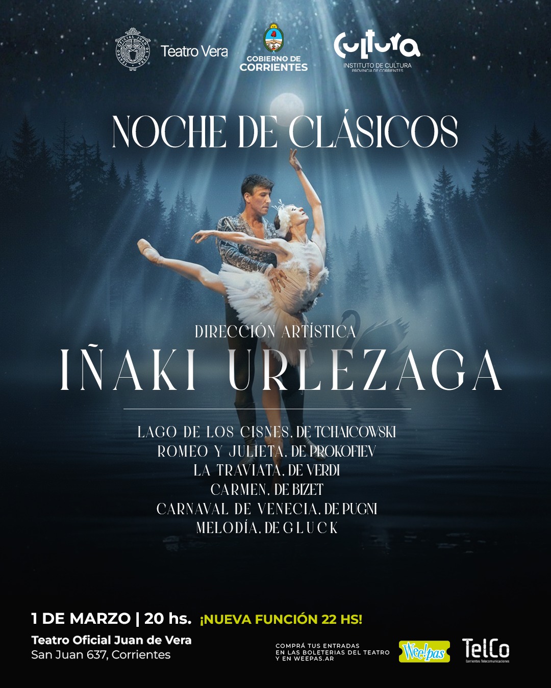 Debido a la gran expectativa y al agotamiento de localidades para la primera presentación, se confirmó una segunda función de la gala “Noche de Clásicos” para el próximo domingo 1 de marzo a las 22. El evento, dirigido artísticamente por el reconocido bailarín y coreógrafo Iñaki Urlezaga, marca su esperado regreso a Corrientes tras 15 años de ausencia. El artista llega precedido por un importante reconocimiento, tras haber resultado reciente ganador del premio “Estrella de Mar” a la mejor compañía de danza nacional.