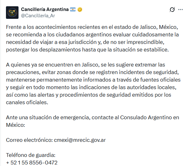 El Gobierno argentino, a través del Ministerio de Relaciones Exteriores, Comercio Internacional y Culto, recomendó evitar viajes al estado de Jalisco ante el incremento de la violencia.