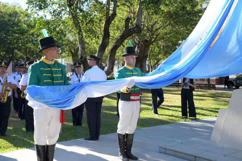 En la plaza 25 de Mayo, frente al monumento ecuestre al Padre de la Patria, el intendente Claudio Polich encabezó el encuentro, que contó con la participación de funcionarios comunales y provinciales, legisladores y representantes de diversas instituciones del medio.