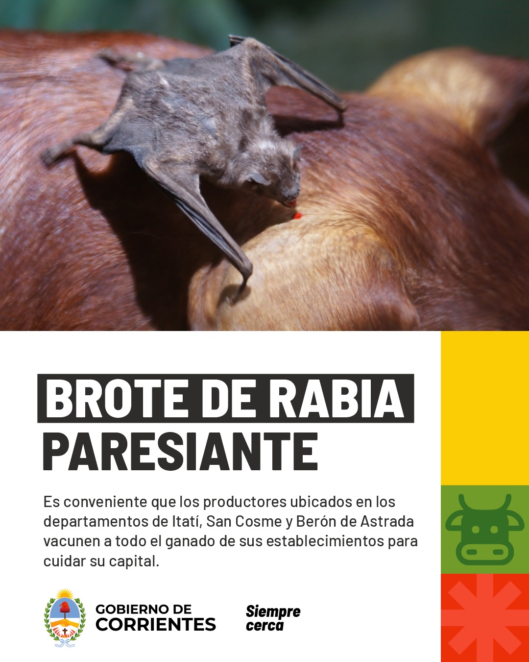 El Ministerio de Producción de Corrientes recomendó reforzar la vacunación del ganado tras la confirmación de un caso positivo de rabia paresiante bovina en el norte provincial. La advertencia está dirigida especialmente a productores de los departamentos Itatí, San Cosme y Berón de Astrada, donde se intensificaron las medidas sanitarias para evitar la propagación de la enfermedad.