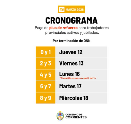 El Gobierno de Corrientes informó sobre el inicio del cronograma de pagos correspondiente a marzo. El beneficio se abonará por terminación de DNI a trabajadores activos y jubilados.