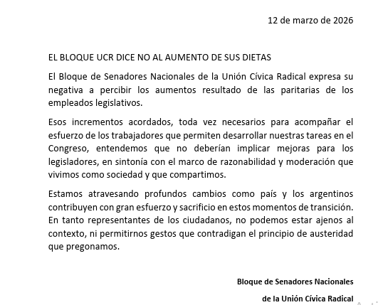 A través de un comunicado, los legisladores radicales señalaron que, si bien consideran necesarios los aumentos otorgados al personal del Poder Legislativo, entienden que esos incrementos no deberían trasladarse automáticamente a las dietas de los senadores.