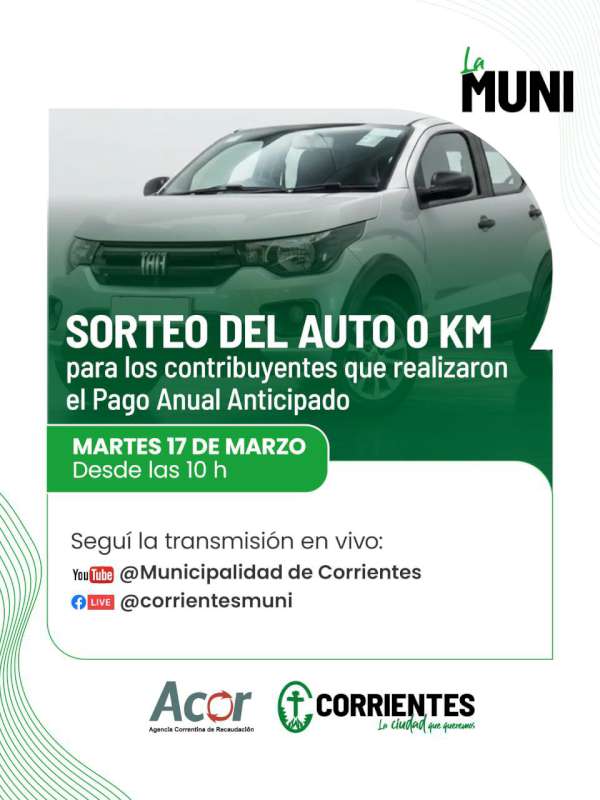 La Municipalidad de Corrientes informó que el 17 de marzo tendrá lugar el sorteo del auto 0 km entre los contribuyentes que adhirieron al Pago Anual Anticipado de sus impuestos, tasas, servicios y contribuciones de 2026.